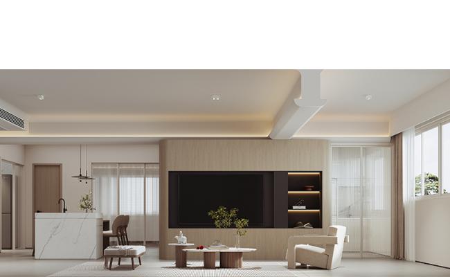 現(xiàn)代風(fēng)格空間設(shè)計(jì)理念 本空間以「溫潤極簡·自然共生」為核心,以米白、淺木色構(gòu)建柔和基底,弱化硬朗線條,營造松弛的居住氛圍。開放式布局結(jié)合挑高空間,最大化引入自然光線,讓視野通透舒展。木質(zhì)感柜體與簡約軟裝相融,摒棄冗余裝飾,以“少而精”的設(shè)計(jì)邏輯,平衡現(xiàn)代美學(xué)的利落與自然材質(zhì)的溫度,打造兼具實(shí)用與詩意的生活場域。