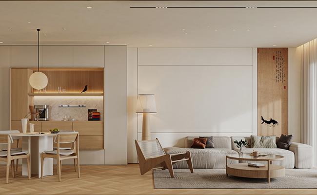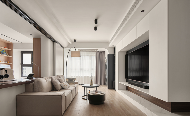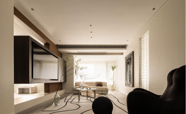 不是被拿來設計的藝術品 而是純粹生活的有機體 避開千篇一律的傳統設計 節奏得當的空間格局 平滑面與凹嵌體相連 一寬一窄,彰顯客廳氣勢 一高一低,抒發靈活趣致 呈條狀的木格柵營造出 懸浮姿態的奇妙美感 隨著光影的加深 高密度純色拾取到一絲親切 流露出現代簡約的美感