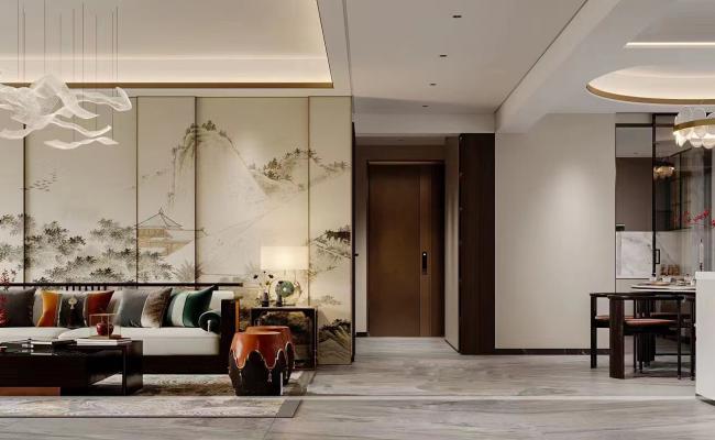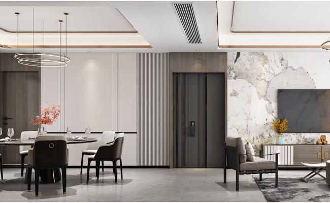 其設計理念緊密圍繞?新中式風格?展開,巧妙地將傳統中式元素與現代設計手法相融合,營造出既具有文化底蘊又不失現代舒適感的居住環境。 傳統與現代的結合?:整體設計在保留中式風格的神韻基礎上,融入了現代設計的簡潔與實用。墻面、地面和家具的線條簡潔流暢,同時又不失中式風格的典雅與莊重。 色彩搭配?:以米色、棕色等自然色調為主,營造出溫馨舒適的氛圍。大理石電視墻的自然紋理與木質家具的溫潤質感相互映襯,增添了空間的層次感和視覺深度。