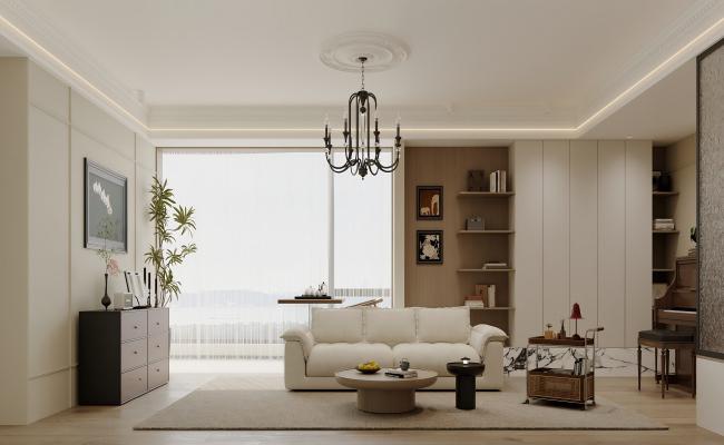 整體空間的布局考慮到了實用性與美感的完美結合。 客廳的中式弧頂設計有效地提升了空間的高度感。同時,通過其半吊頂的巧妙處理,也使得整體空間變得更加寬敞明亮,中式弧頂讓客廳的上方空間顯得更為開闊,消除了可能存在的壓抑感。 半吊頂的設計則充分利用了空間結構,它在不占用過多空間的情況下,合理地調整了視覺效果,讓整個客廳看上去比實際面積更顯寬敞。