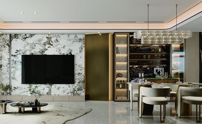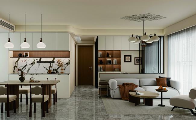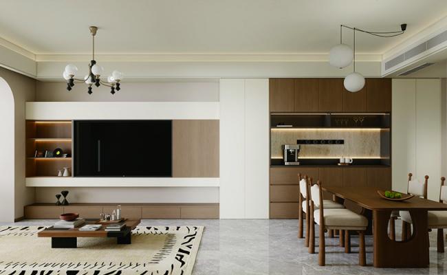 業主倆是00后小年輕,喜歡接納度高的東西,客餐廳喜歡中古風,主臥喜歡法式風。設計上,在硬朗的直線中注入柔和的弧形線條,以胡桃色的沉穩為基調,搭配藤編棉麻的天然材質,通過材質的自然碰撞,營造出一種“不費力”的自然感。