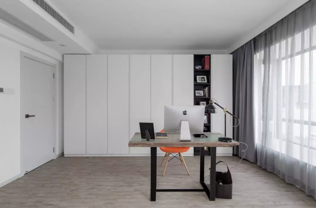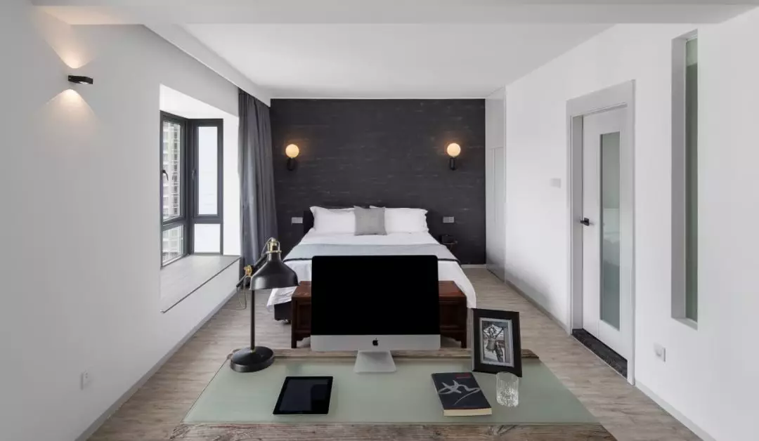 三房改造兩房,讓空間利用得更加清逸自如。臥室同樣承襲了LOFT工業風精簡、藝術的基因,感覺像是被雕刻著用刻刀剔除所有的不必要,簡約的天花,消除建筑建構給人的壓迫感。