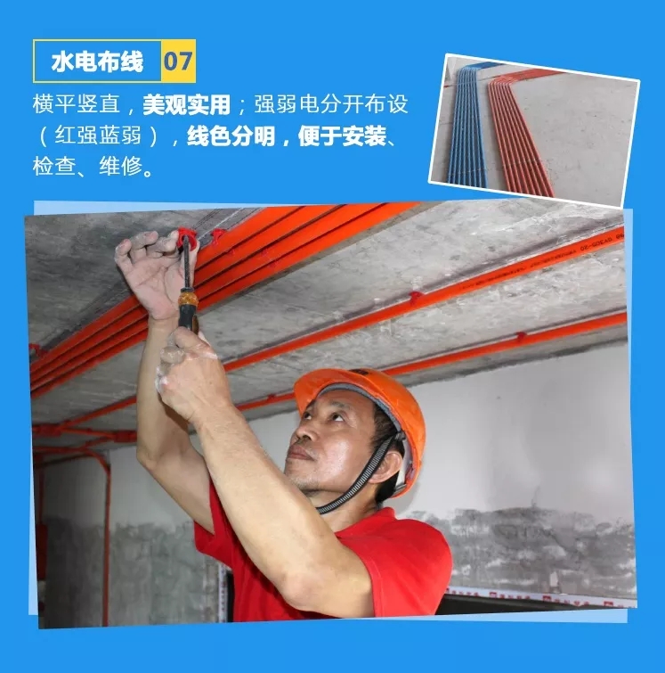 為了更好的規范電路工程,確保工程品質,及監理與業主對電工項目的檢查與驗收,星藝裝飾特創雙色電工套管,采用優質的阻燃型有色PVC管作強、弱電線保護管材。紅色——強電及照明用電專用,藍色——弱電項目專用。強、弱電線管交叉時,弱電線管應用錫箔紙作纏繞屏蔽處理,預防信號干擾。更多工藝細節,歡迎預約參觀星藝工地。