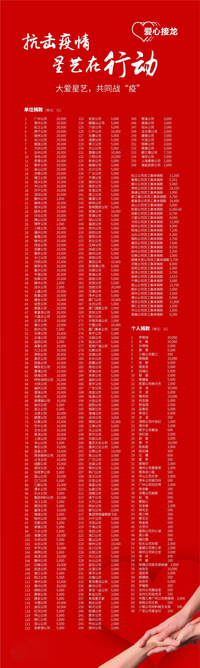 從星藝裝飾“愛(ài)心接龍”開(kāi)啟以來(lái),星藝全國(guó)眾多單位積極捐款,星藝員工自愿捐款,甚至星藝客戶(hù)也通過(guò)“愛(ài)心接龍”捐款……同心抗疫,星藝在行動(dòng),凝聚起抗擊疫情的強(qiáng)大力量!