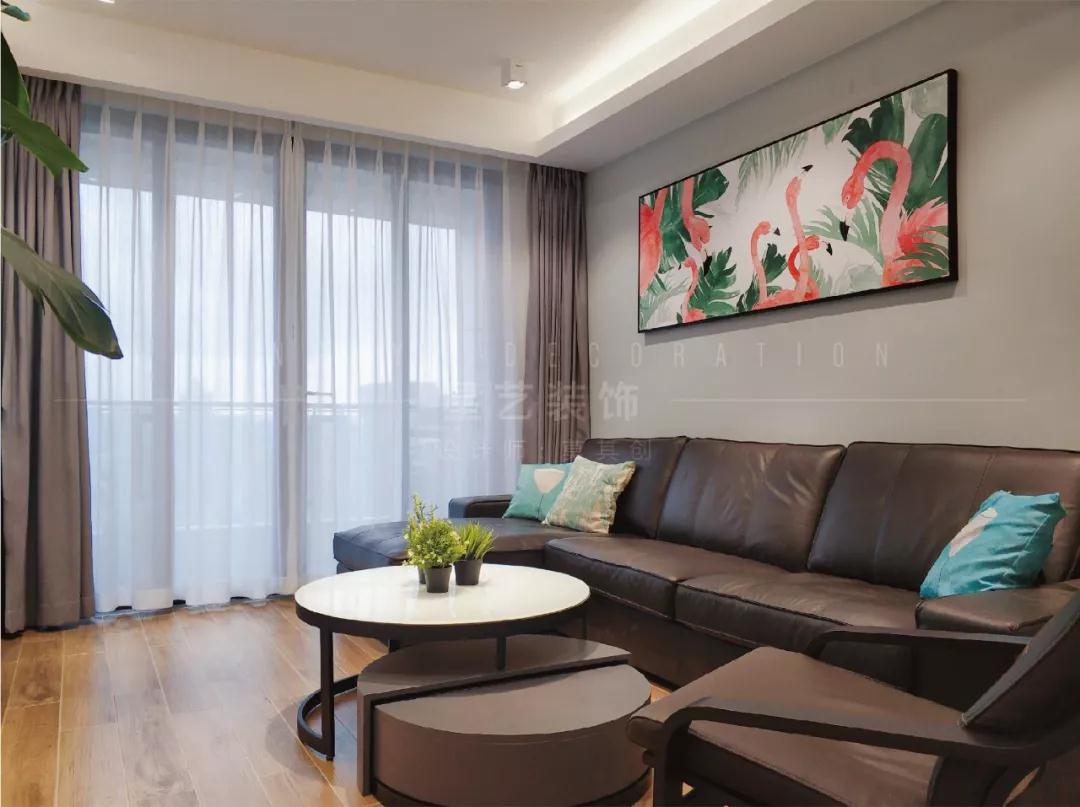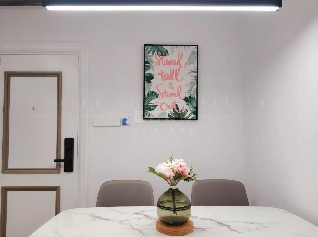 客廳沙發(fā)背景墻選擇帶有火烈鳥(niǎo)圖案的掛畫,呼應(yīng)了擺放在客廳里那棵較大的植物,火烈鳥(niǎo)寓意自由熱烈、優(yōu)雅活力,跳躍整個(gè)空間寧?kù)o的氛圍。