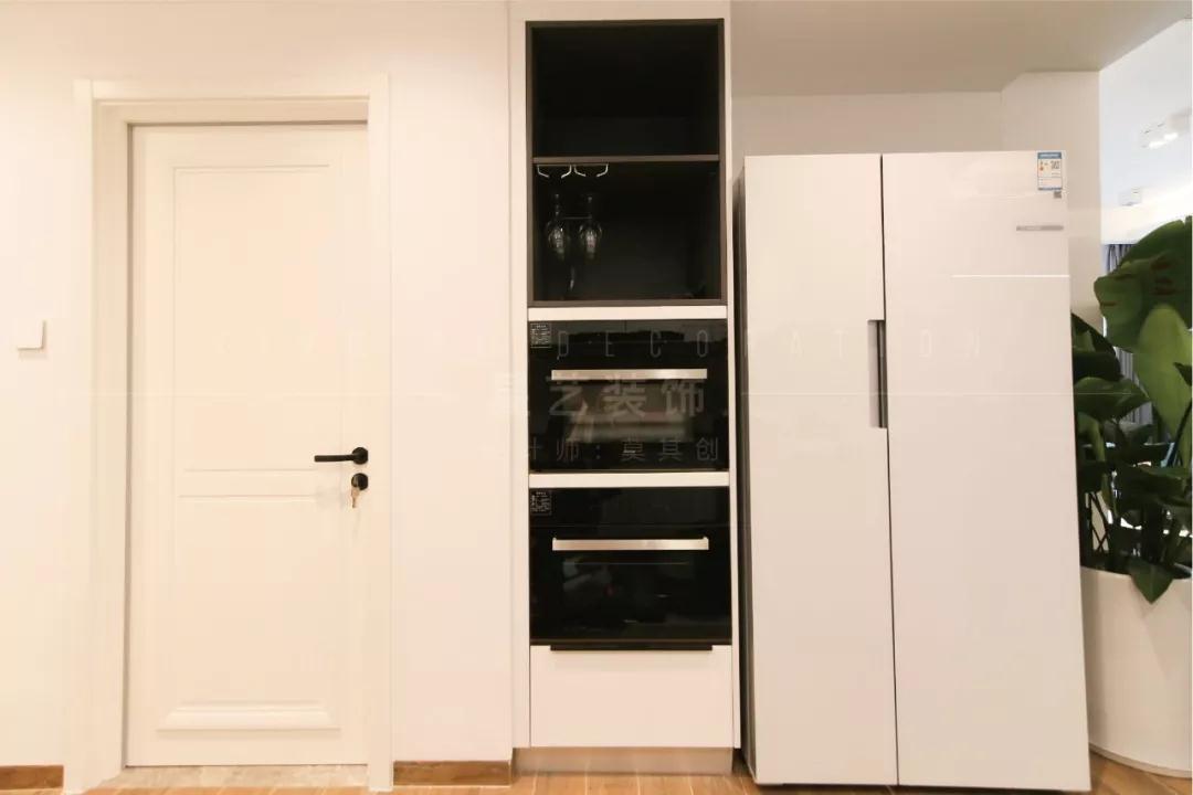需要解決原廚房狹窄的問(wèn)題,把占用一定空間的衛(wèi)生間門移到原本過(guò)道的衣帽間的衛(wèi)生間,把廚房空的操作臺(tái)擴(kuò)大,而冰箱、烤箱和紅酒柜等設(shè)計(jì)在過(guò)道上,這樣廚房的空間也通透明亮起來(lái),又解決了衛(wèi)生間門口設(shè)計(jì)的問(wèn)題。