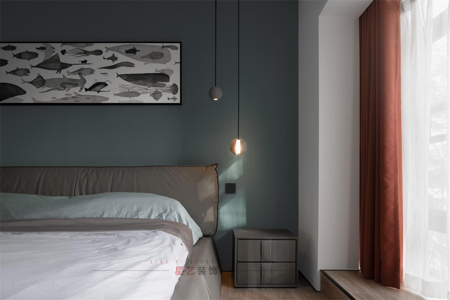 走進臥室,暗綠色的墻面放上海洋元素的掛畫,一瞬間好像進入了海底森林,去探尋生命的意義。筆直的時尚吊燈和墻面讓臥室的精致度得到大幅提升,橘色的窗簾也讓暗色的空間眼前一亮。