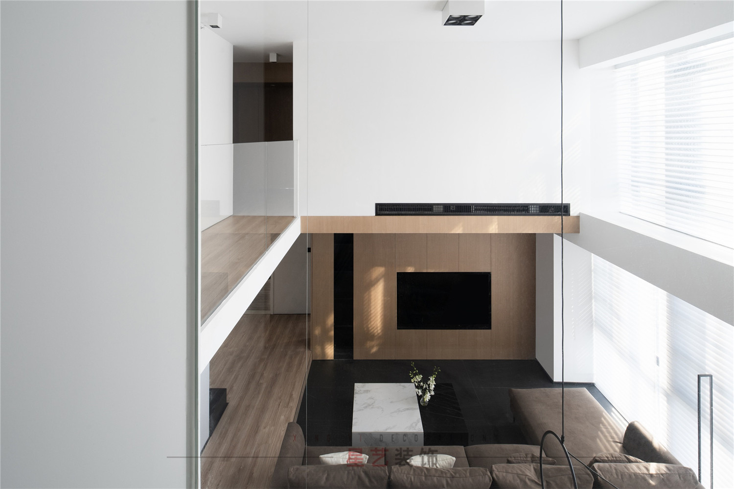 從二樓俯瞰視角就能明顯的發現,客廳的整體的設計非常靈活,根據時間變化的光影效果能營造出各種美輪美奐的夢幻空間。