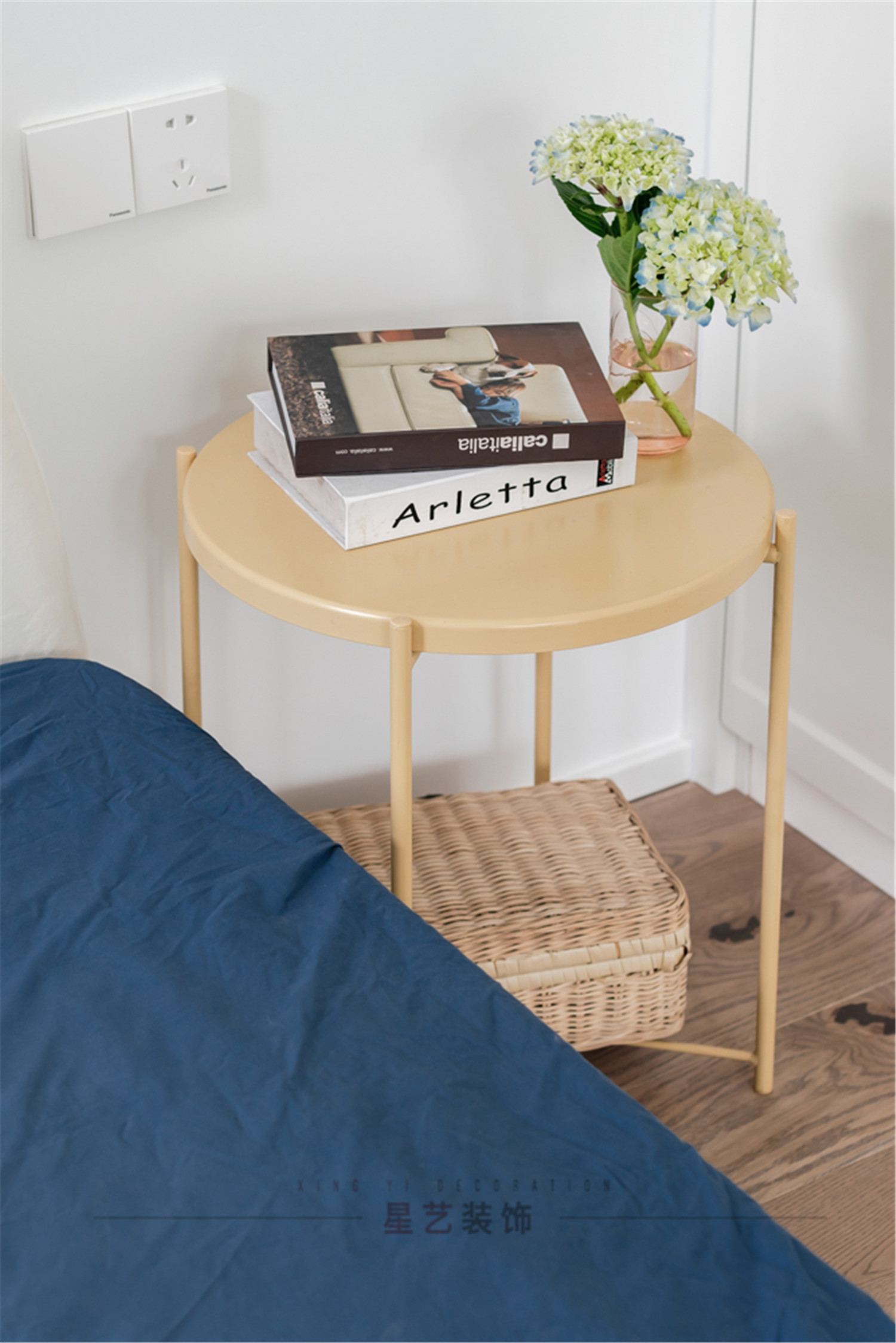 臥室在床頭的位置設計了小面積的落地窗,打破整體白色帶來的空曠感,增加層次關系。半圓形靠背搭配藍色床墊,仿佛置身于海上明月的光景中,給人帶來無限遐想