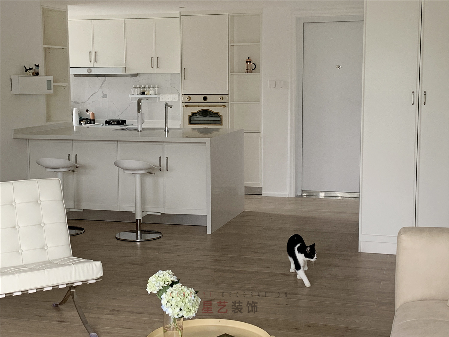照明是摒棄傳統一個主燈點亮整個房子的方式,采用射燈,軌道燈,燈帶局部照明,讓整個房子更有層次,不管是軌道燈打到墻上反射出來的還是燈帶從天花折射出來的燈光都是非常柔和的,即使是射燈也是采用4000K(中性光)防炫射燈,讓整個空間更加柔和舒適。墻面及所有房門跟柜體也是統一白色讓整個房子更整體,踢腳線也是采用宅邊白色貫穿整個房子。