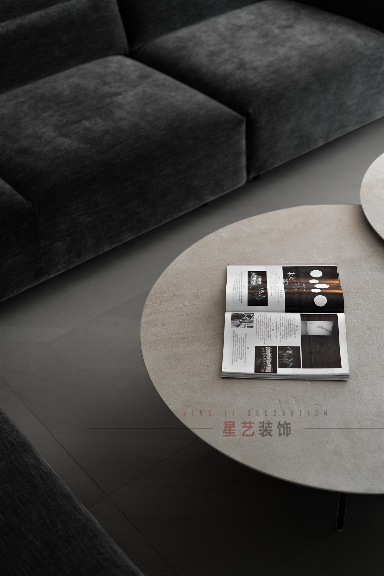 客廳是經典的黑白灰設計,極簡風格盡顯高級大氣,柔軟舒適的絨面深色沙發(fā)搭配拼接圓桌,簡約精致又賦予時尚魅力,整體上僅用色彩的沖擊與家具的質感展現設計的精妙。