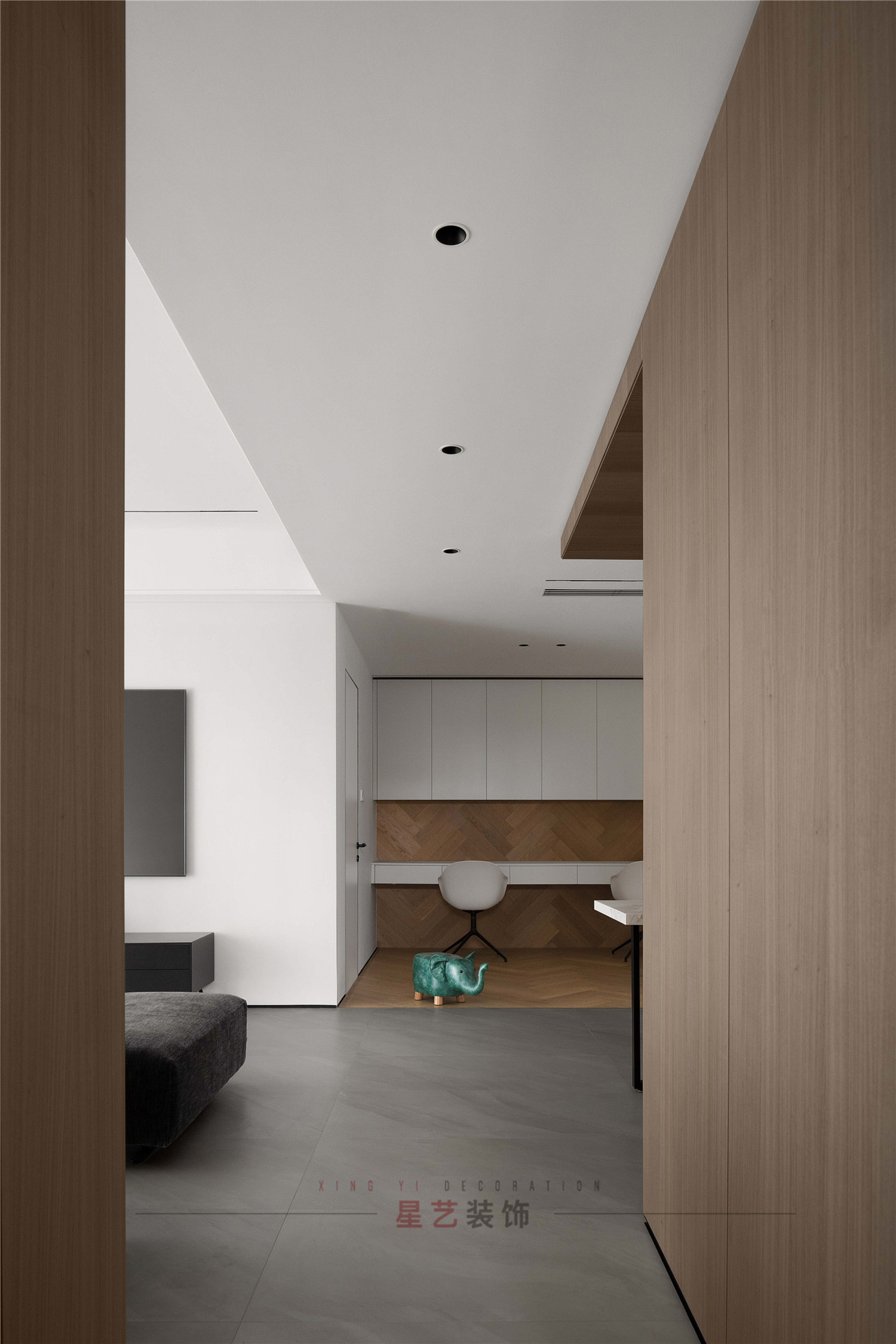 長輩房與收納間門口沒有浪費,設計成孩子自己的學習玩耍區(qū),整排的儲物柜滿足孩子的收納需求,開放的區(qū)域也能體驗溫馨的親子時光。