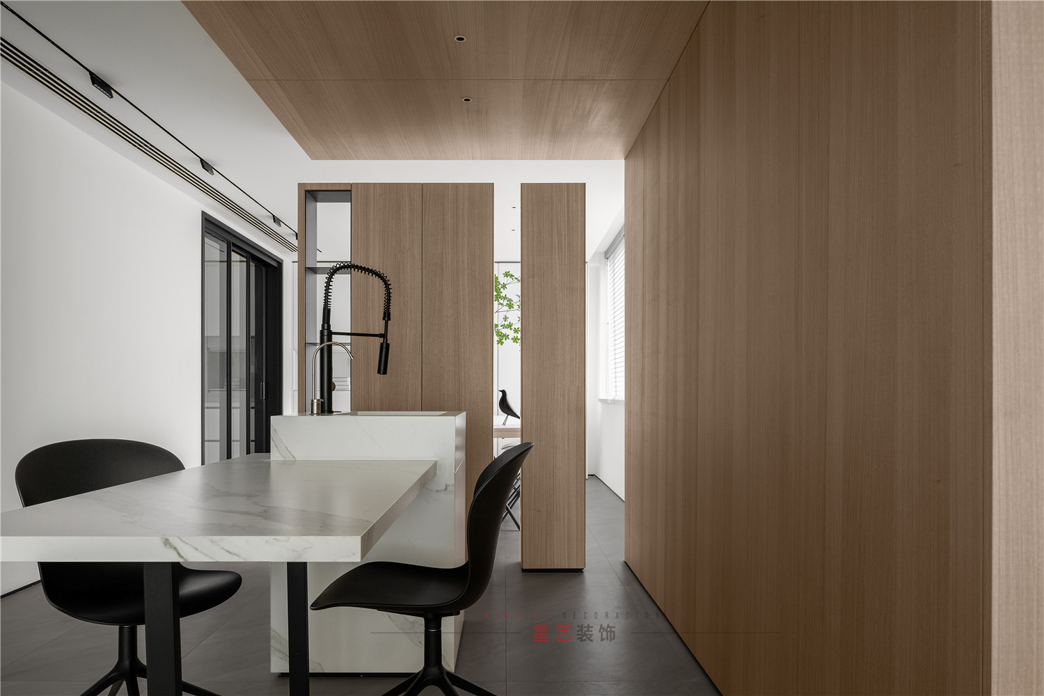 餐廳部分清新明亮,大面積的百葉窗與白色儲物柜在視覺上延伸用餐區(qū)的空間,黑白相間的桌椅虛實結合,讓整個空間有了沉穩(wěn)的底色,像是化雪后清晨,迸發(fā)勃勃生機。