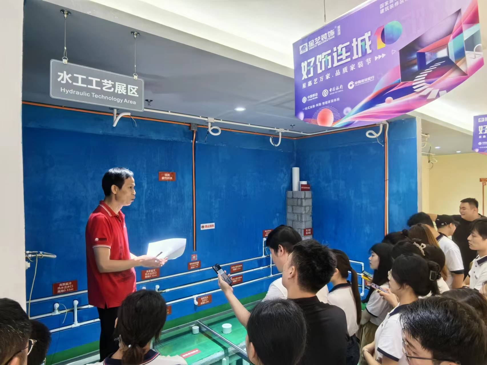 余經(jīng)理借助星藝展廳的工藝展示,介紹了墻面和吊頂工藝流程+衛(wèi)生間沉箱施工。